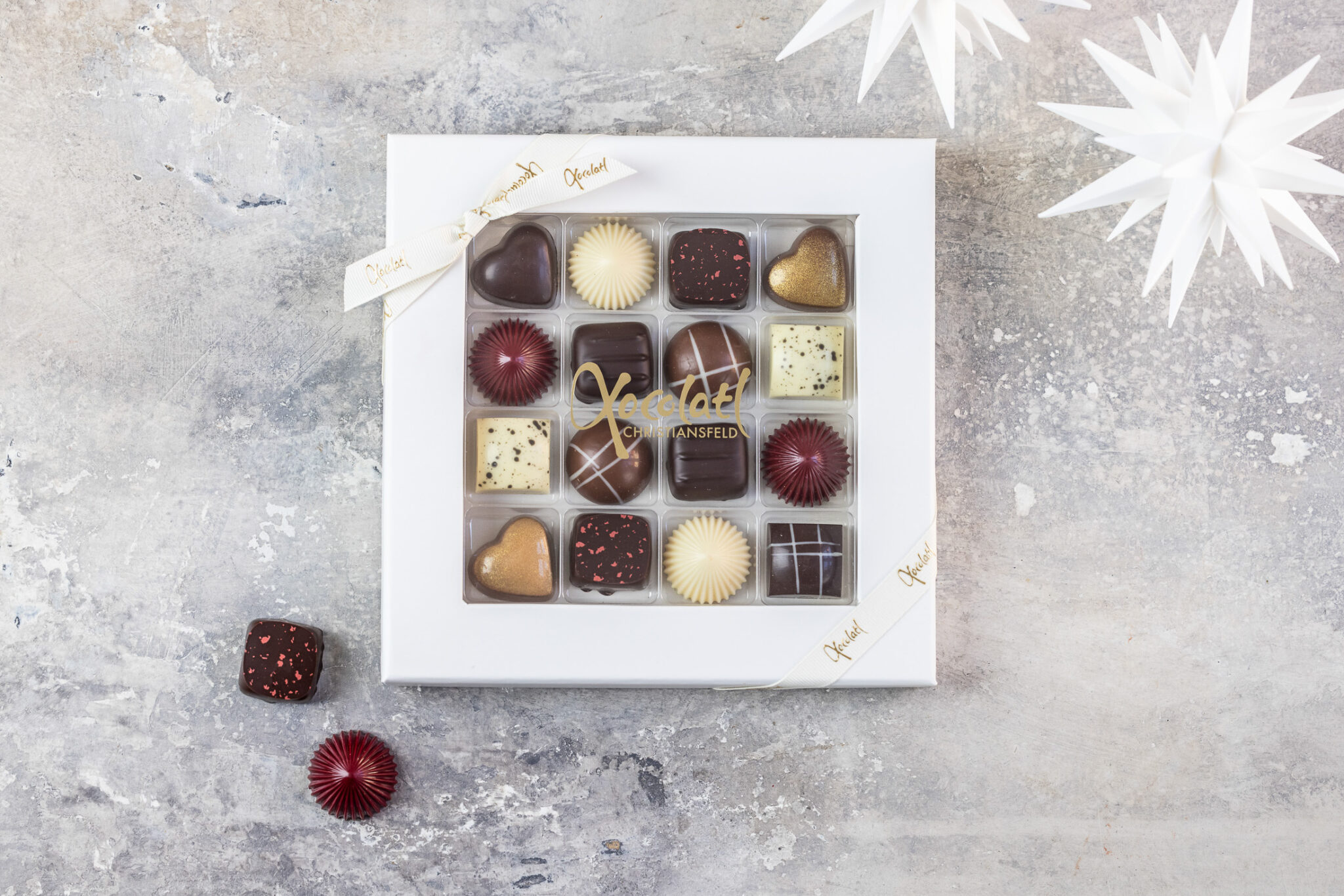 16 fyldte favorit chokolader er samlet i en smuk luksus æske, som vil pynte på det fine julebord. I denne æske er der chokolader med marcipan, hasselnød, citron, lakrids, romkaramel, appelsin, kirsebær marcipan, kahlua og også en med lækker velsmagende saltkaramel.