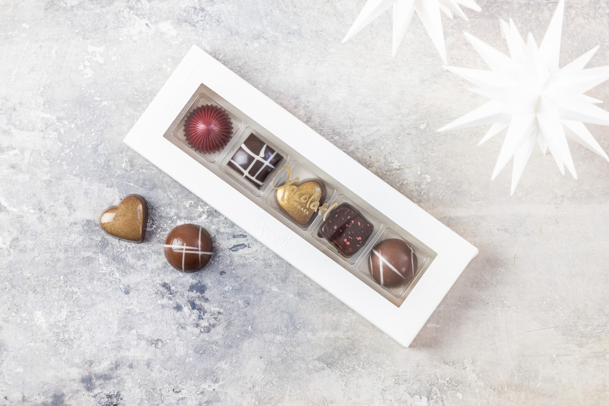 I denne fine lille Christiansfelder æske finder du 5 af vores fyldte favorit chokolader med kirsebær marcipan, romkaramel, appelsin, hasselnød og kahlua.