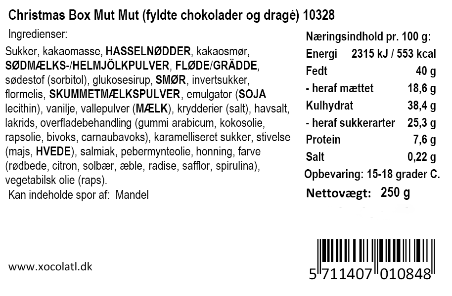 Hyggelig gaveæske med ren mørk chokolade snackbar, hasselnødder med nougat,