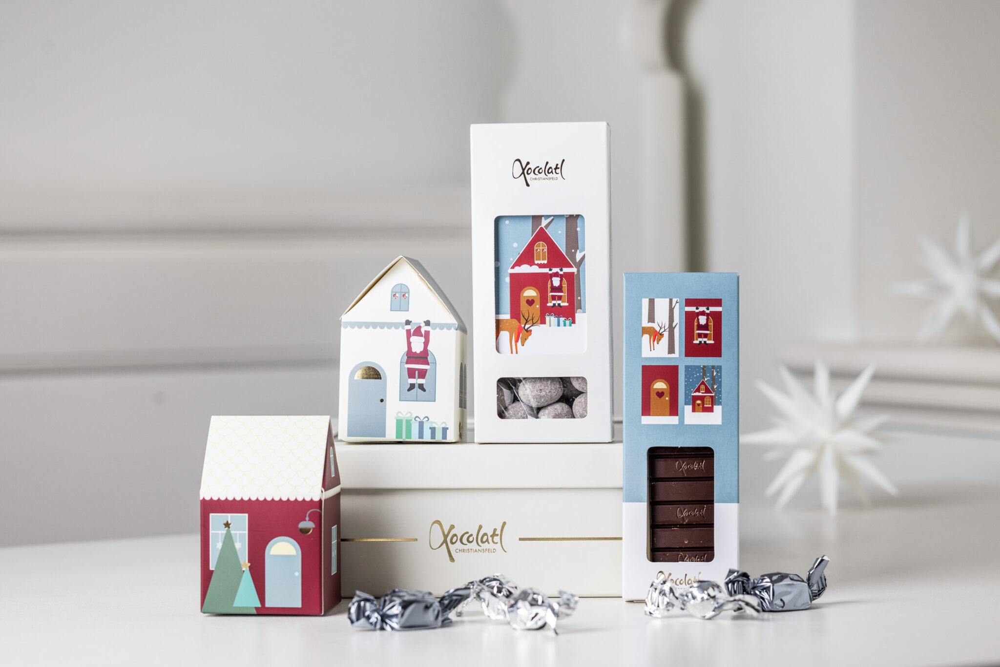 fyldte chokolader enkeltpakket og to søde små huse med chokoladepoletter med karamelfyld.