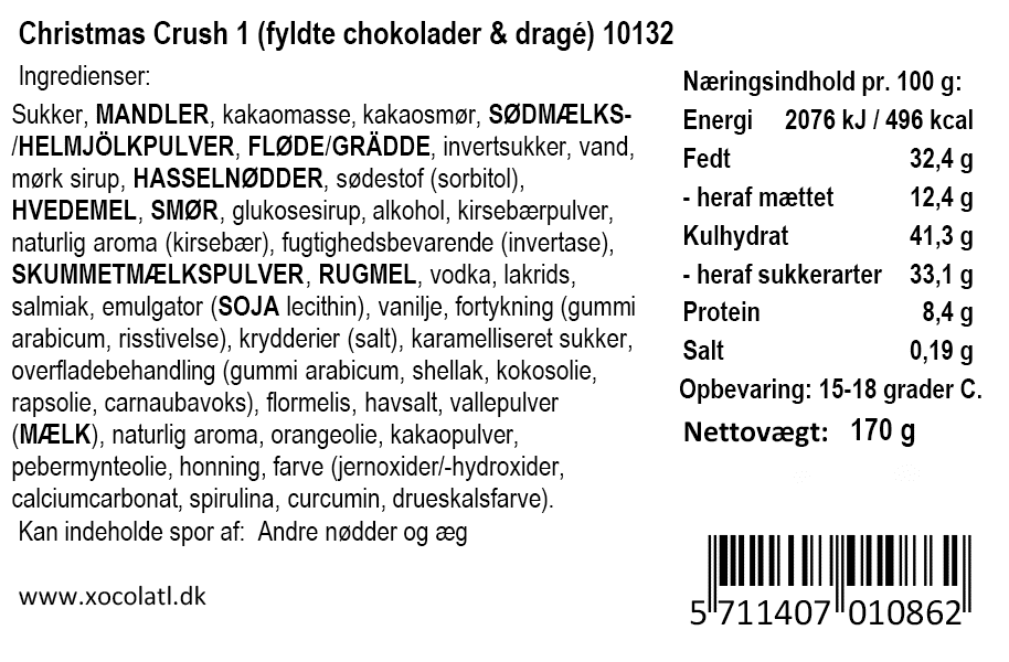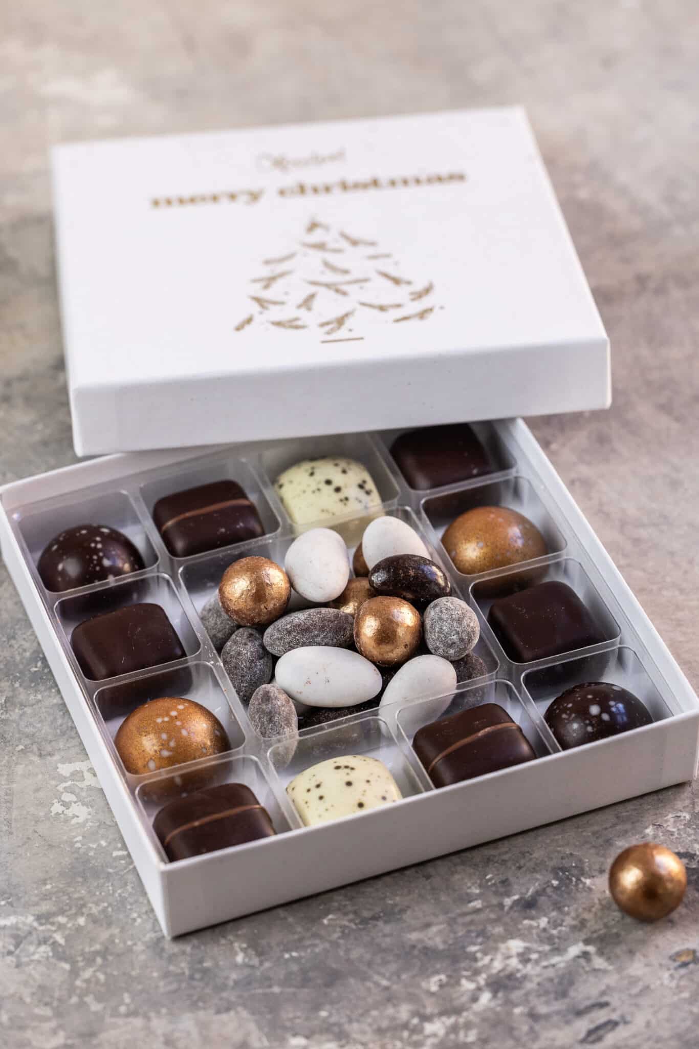 Fin lukket gaveæske med 12 fyldte chokolader med karamel, ganache og marcipan. I midten finder du et lækkert dragémix med chokoladelakrids og chokolademandler