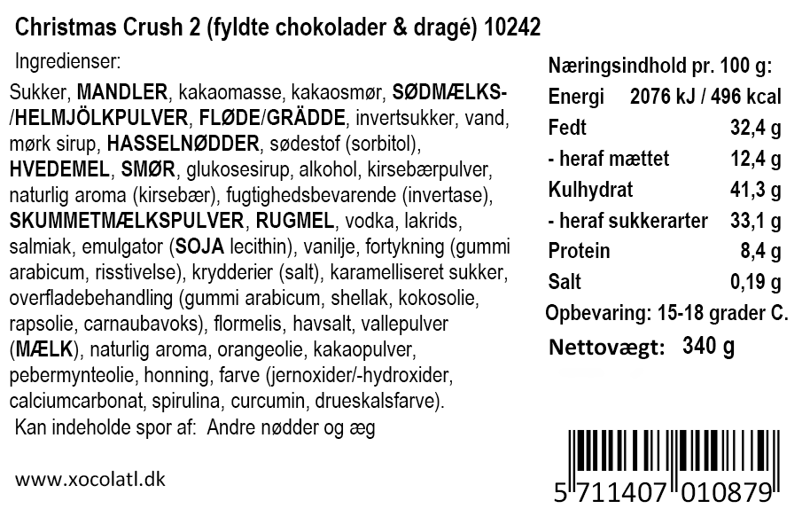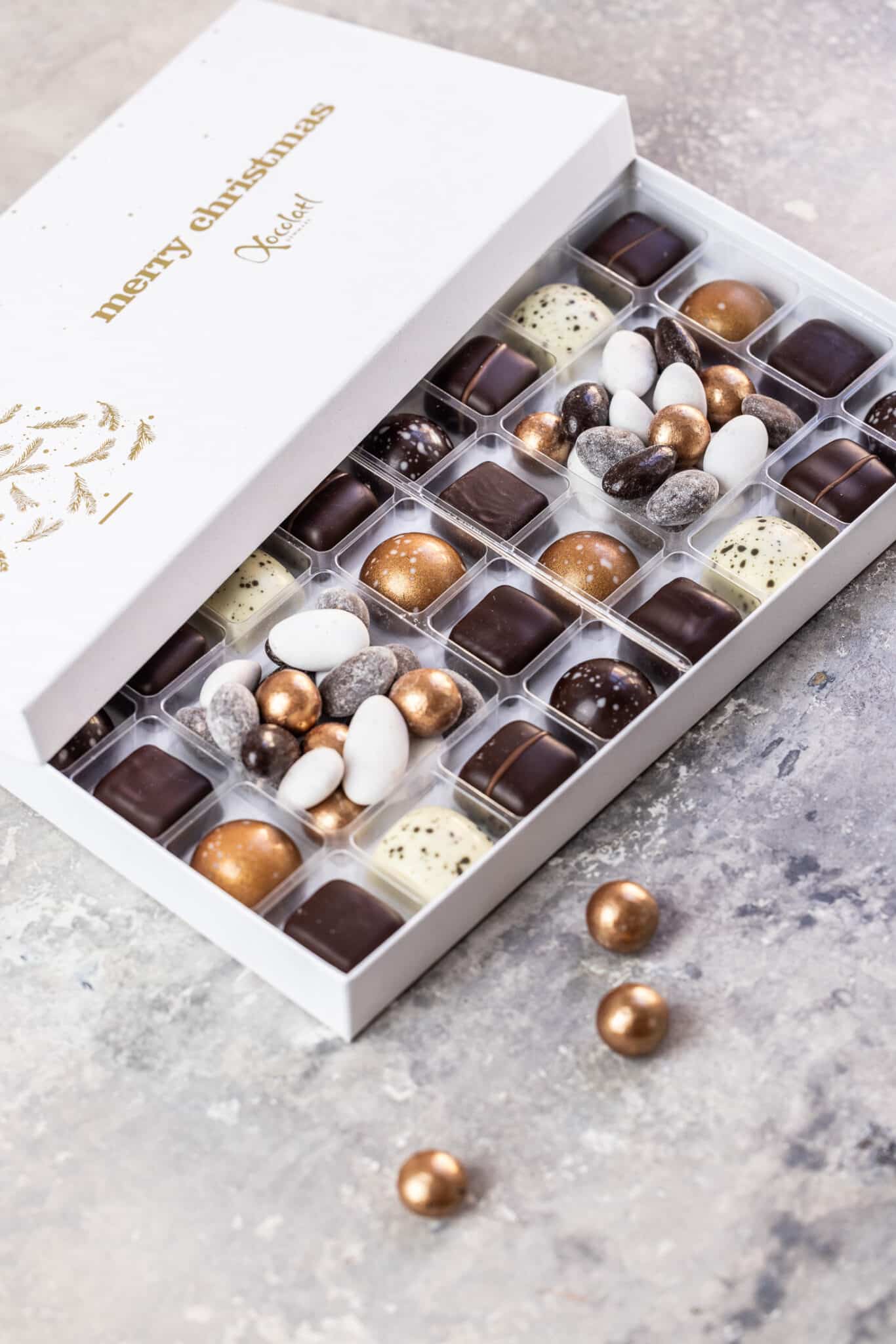 Gaveæske med 24 fyldte chokolader med karamel, ganache og marcipan. i midten et lækkert dragémix med chokoladelakrids og chokolademandler