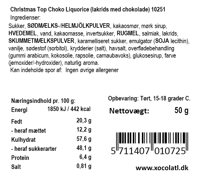Lækker velsmagende lakrids som er overtrukket med karamelchokolade, som befinder sig i en fin juletop.