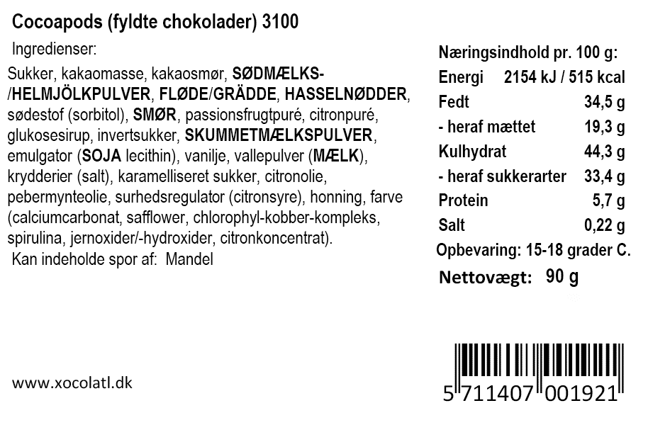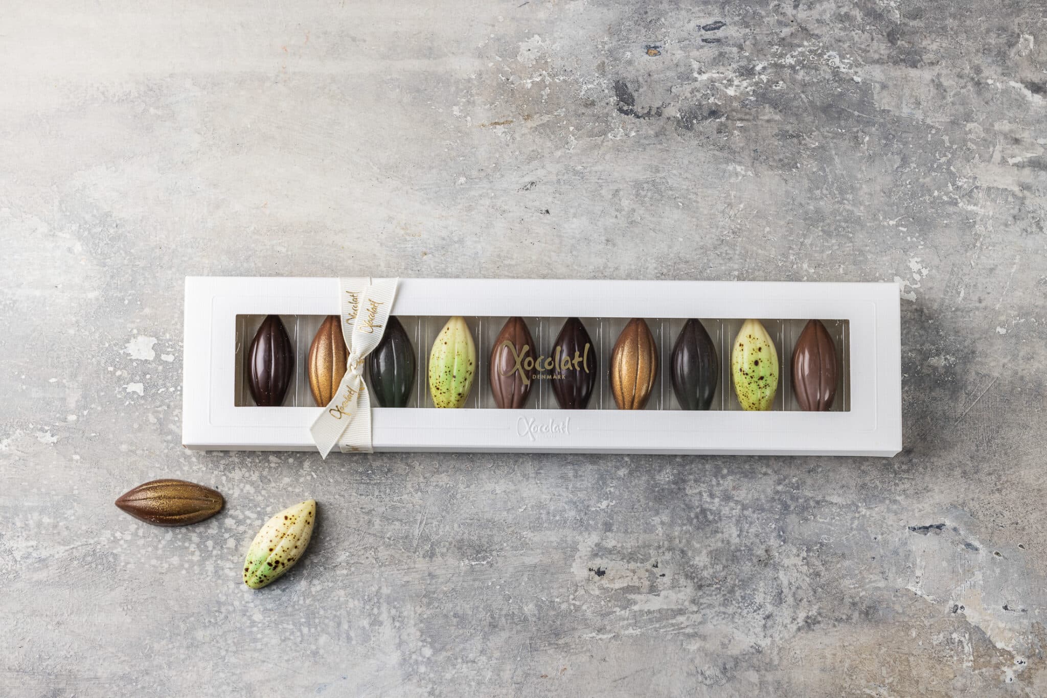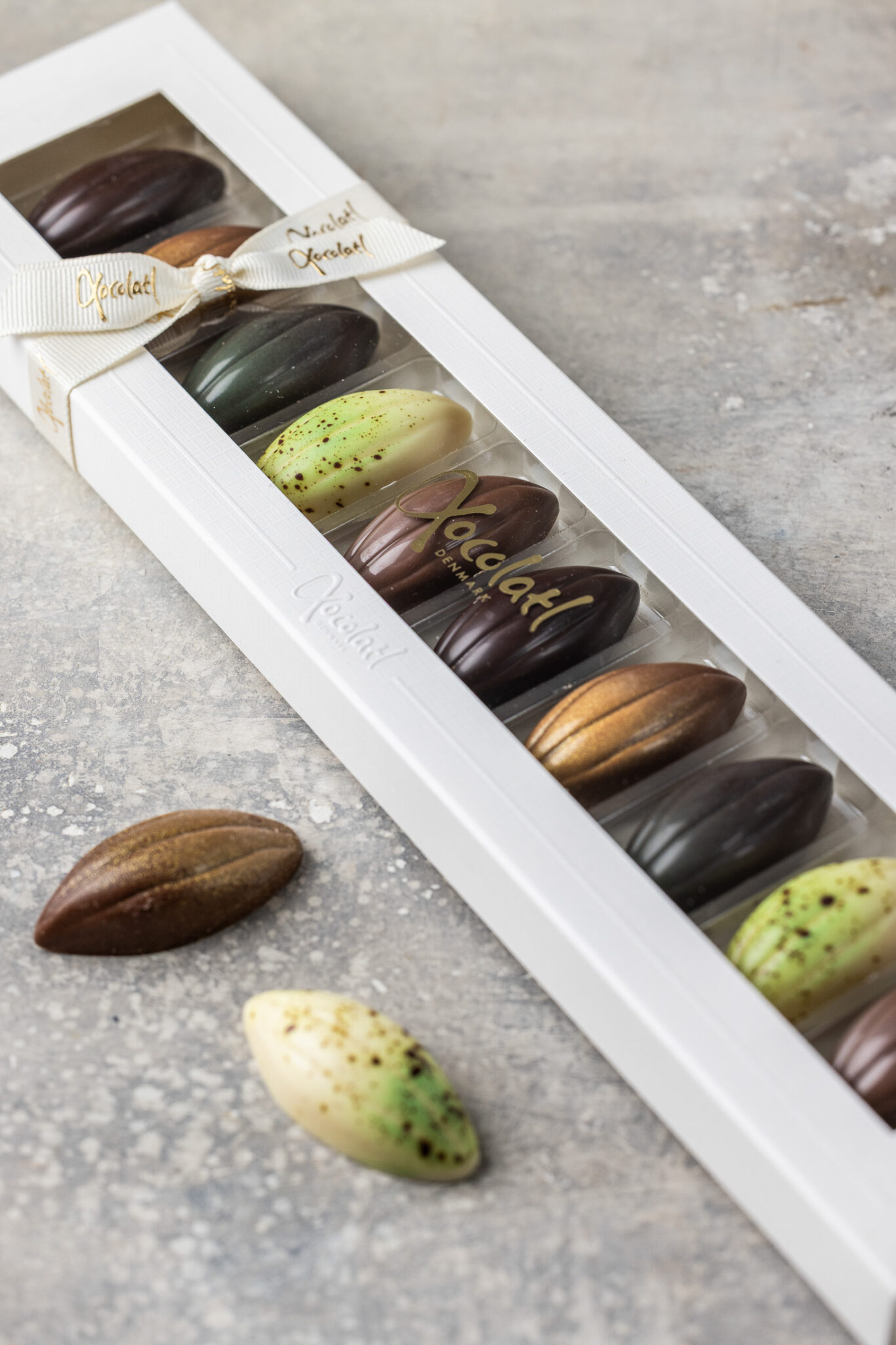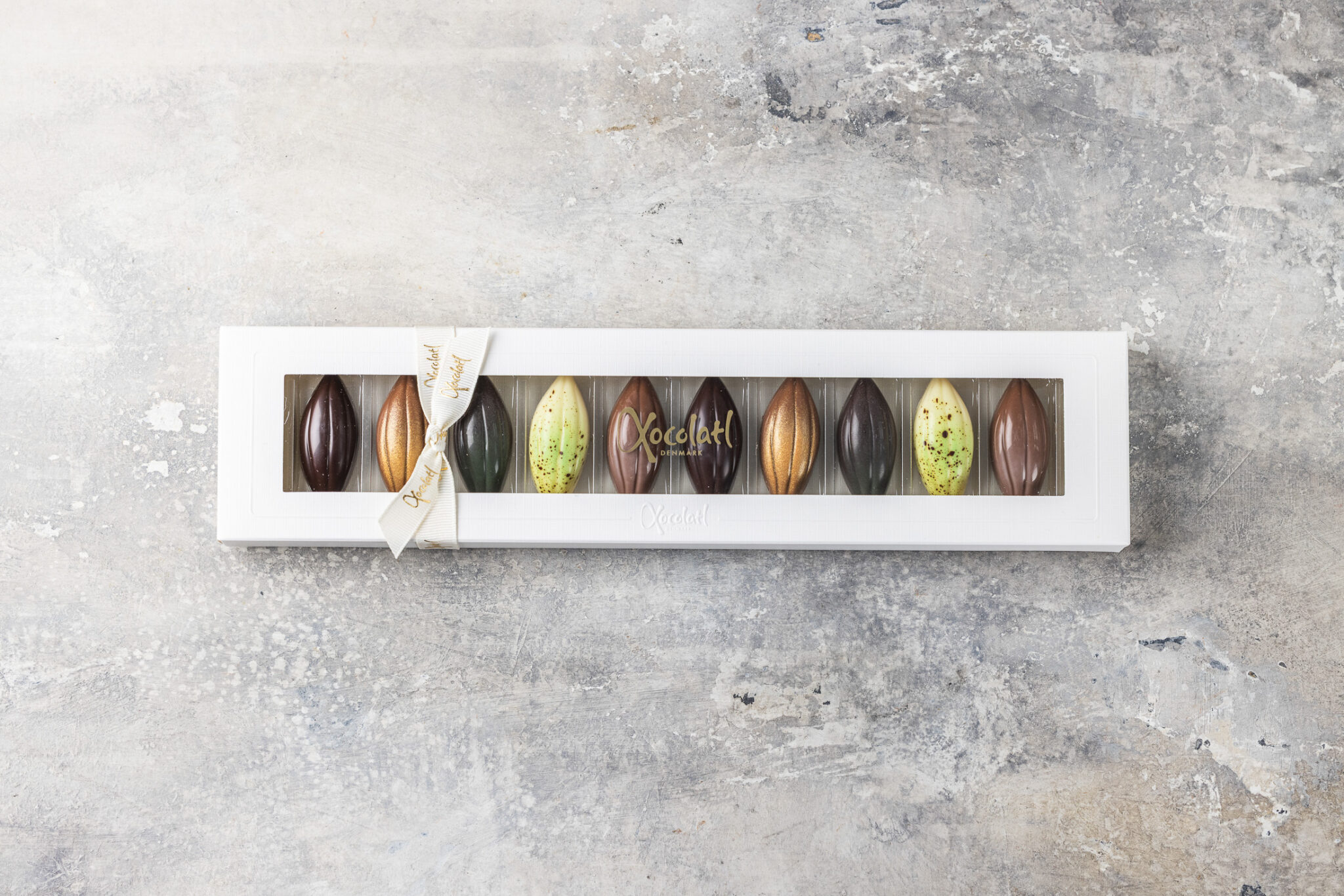 Gaveæske med 10 fyldte kakaofrugter med saltkaramel, citron, nougat, mint og passionsfrugt