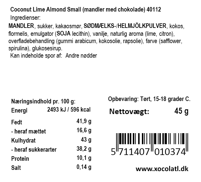 Vores sprøde mandler, der er overtrukket med hvid chokolade tilført kokos og lime.