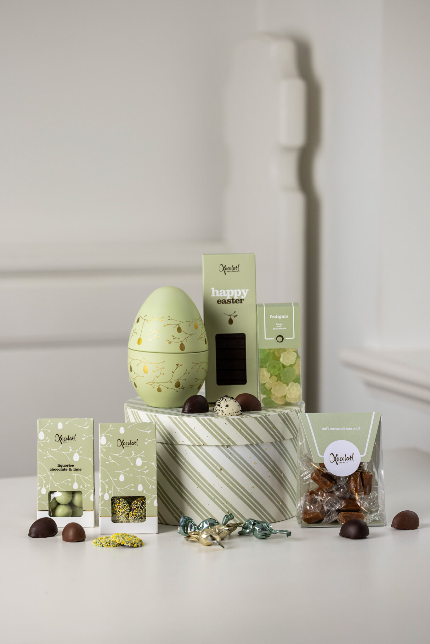 smørbløde karameller med havsalt, mørk chokoladebar, limelakrids, twistpakkede
