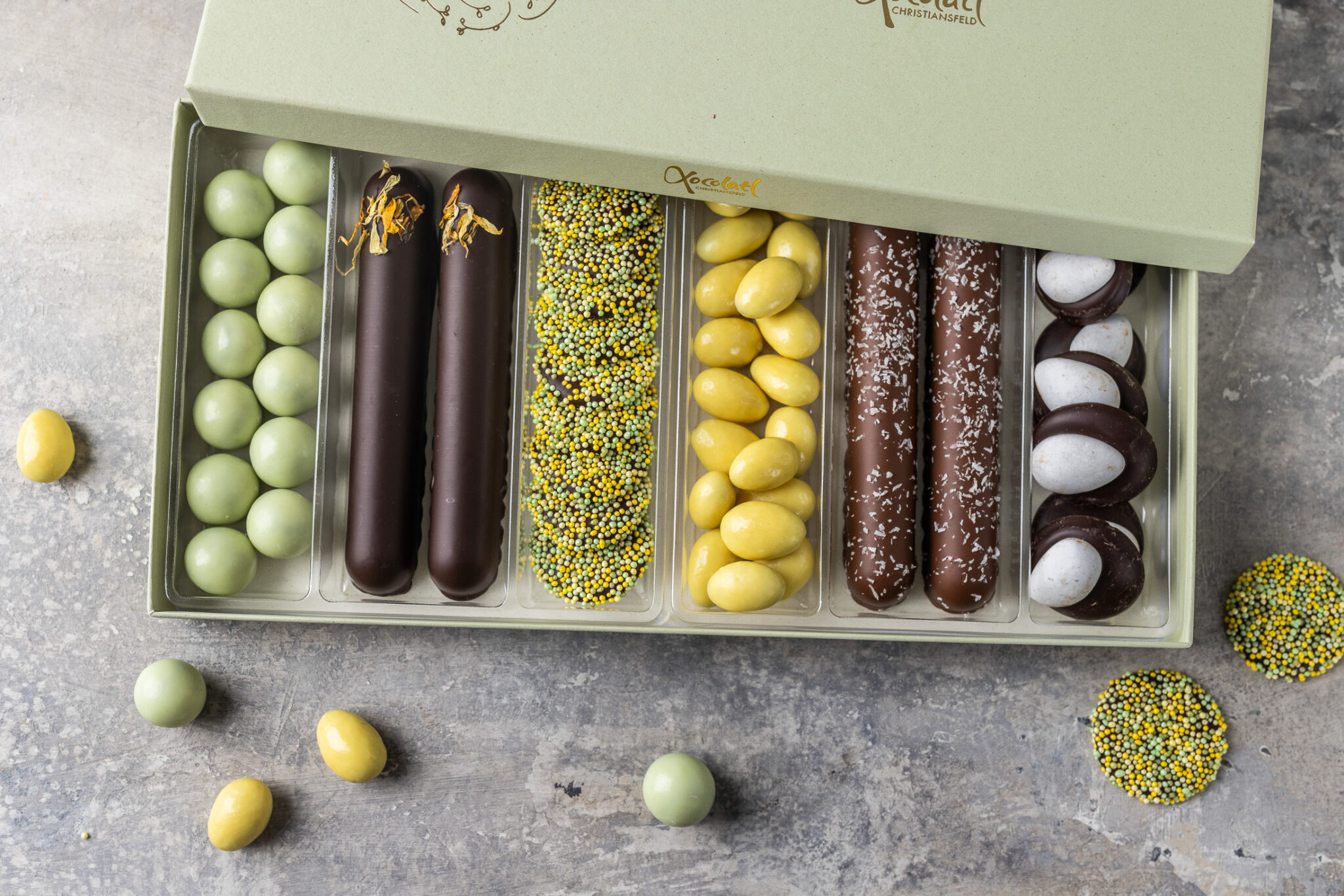 Chokoladelakrids, marcipanstænger, chokoladepoletter med karamelfyld, passionsfrugt mandler og mørke chokoladepoletter med sprøde dronningemandler.