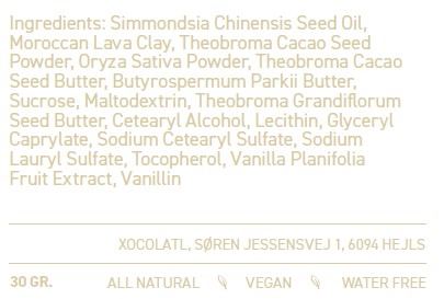 En sanselig chokolademaske med mineraler og rens fra lava ler. Beriget med kakao- og sheasmør samt jojobaolie, som sammen giver intens næring og blødhed. Antioxidanter fra kakao og E-vitamin beskytter huden. Masken indeholder en let eksfolierende effekt fra silkeblødt rismel.