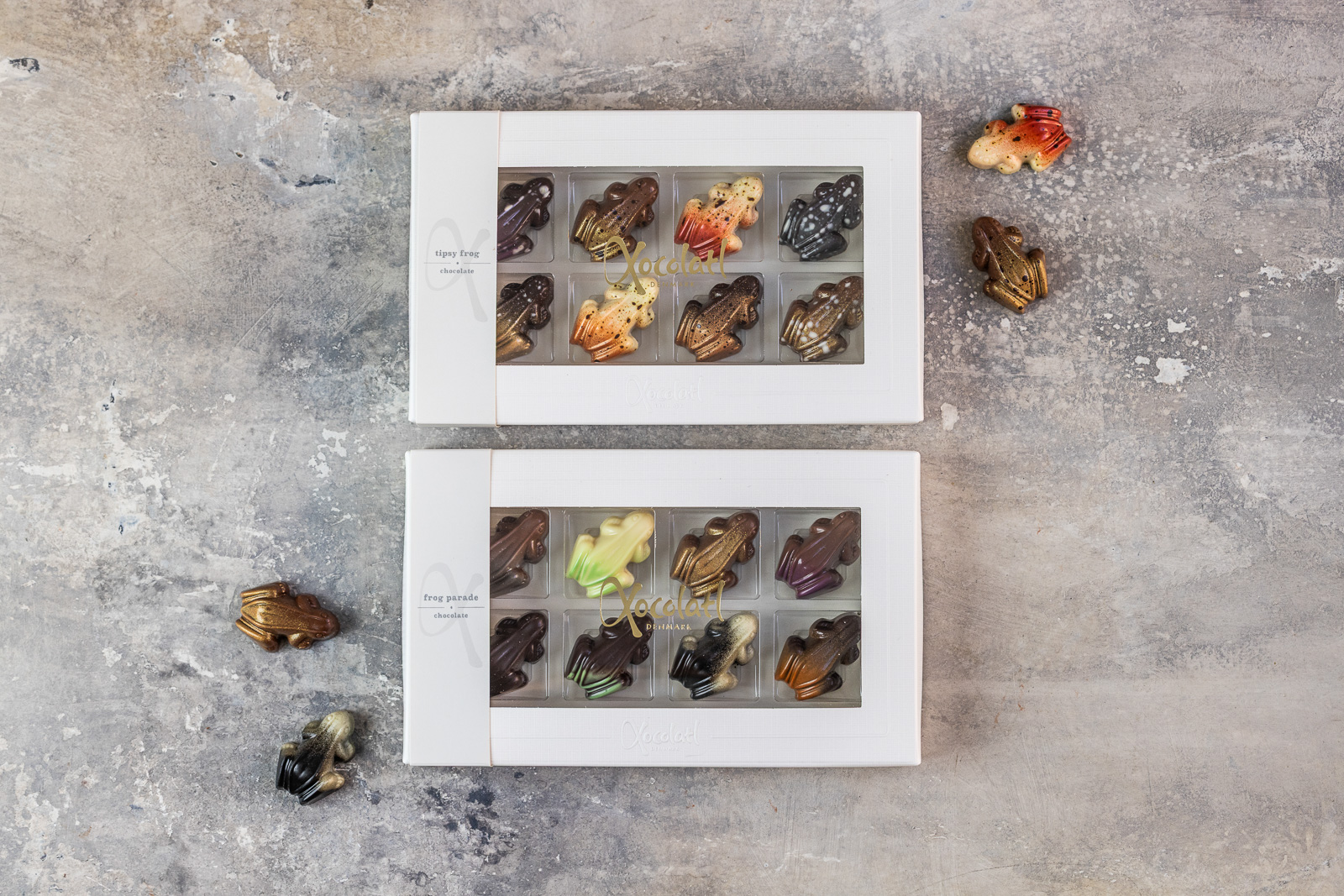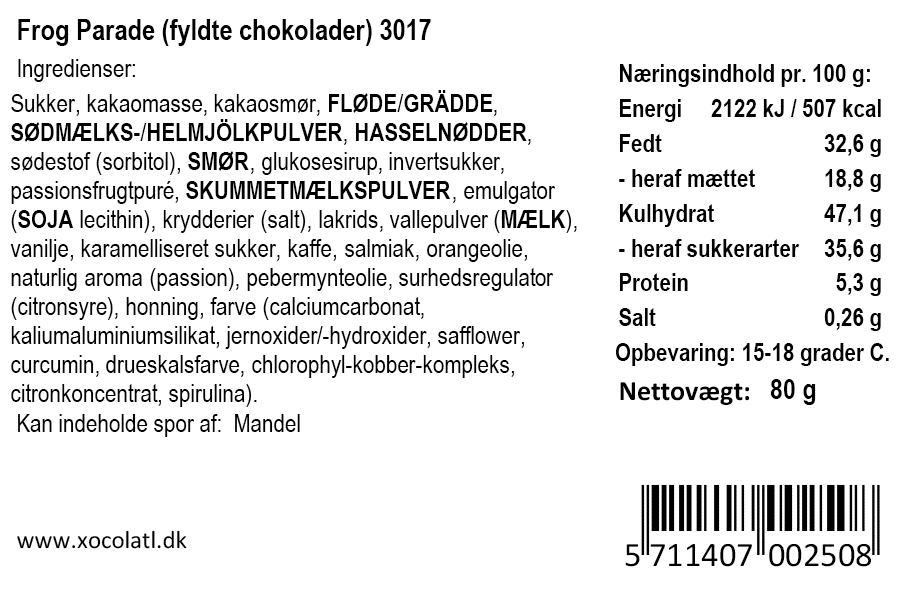 I æsken her finder man 8 fyldte chokoladefrøer med orange, nougat, 70% mørk ganache, passionsfrugt, mint, cremet flødekaramel, lakrids og kaffe