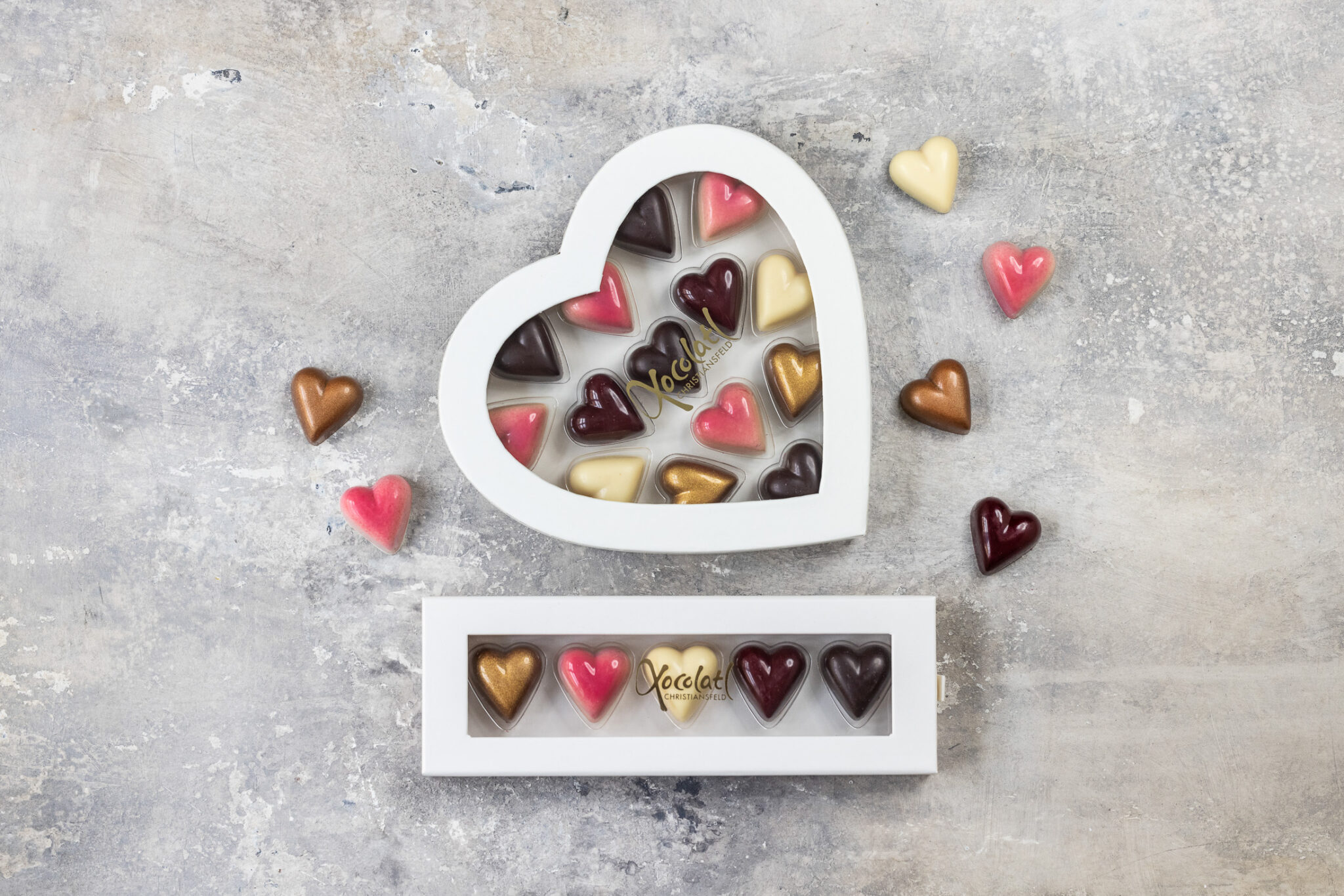 5 fyldte chokoladehjerter med saltkaramel, nougat, solbær og passion/kokos Ca. 50 gr.