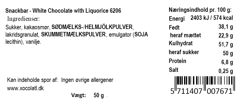 Hvid chokolade snackbar drysset med lakrids og røde bær