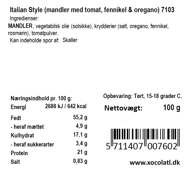 Sprøde mandler med bl.a. tomat, fennikel og oregano. Smagen der minder om den klassiske Margarita pizza