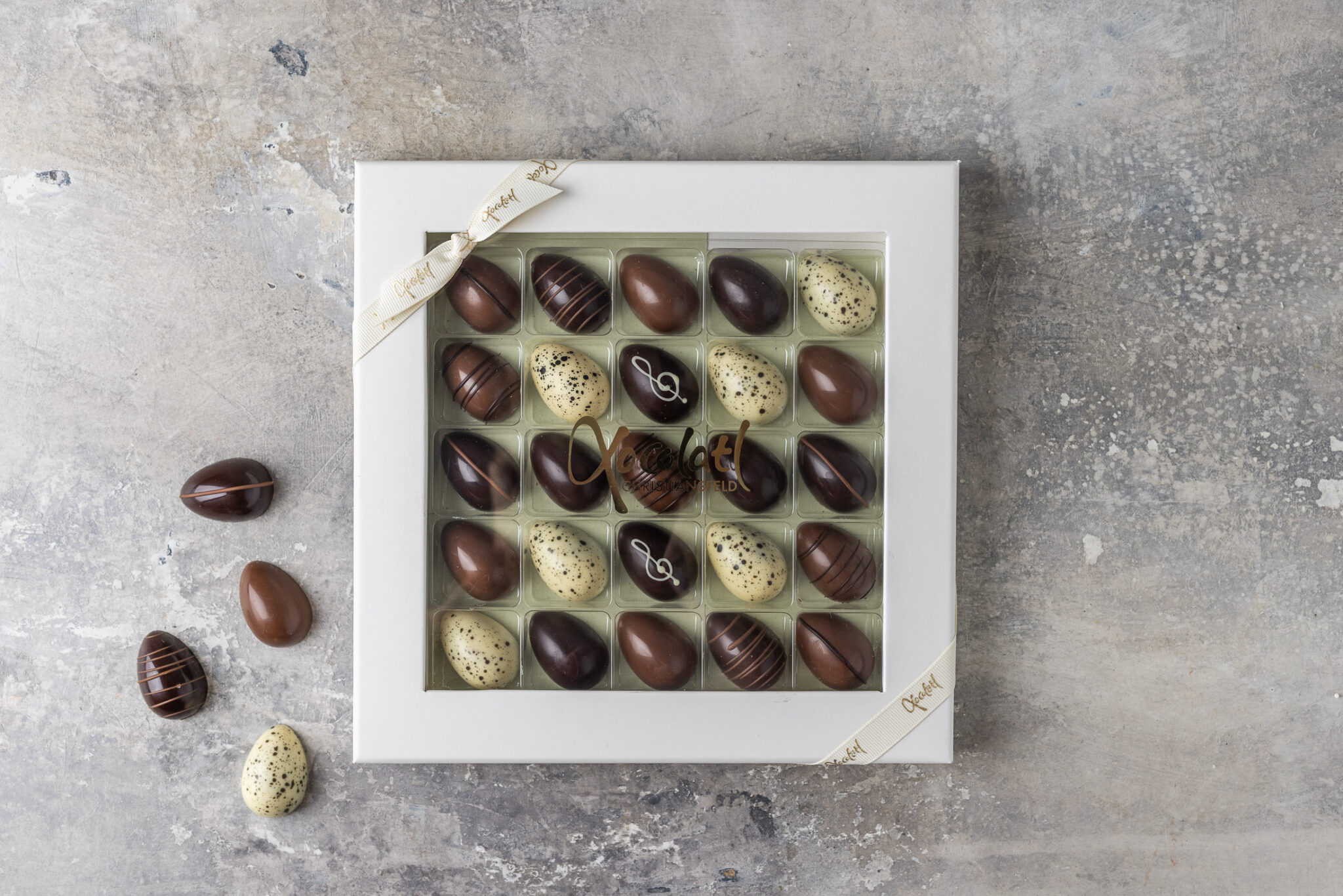 Gaveæske med 25 hånddekorerede marcipanæg, overtrukket med enten 70% mørk