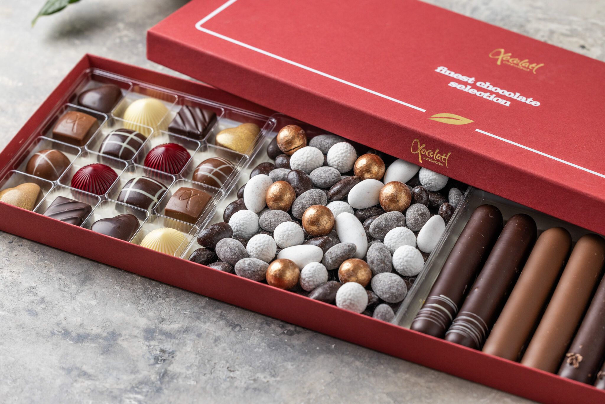 Rød lukket gaveæske med 16 fyldte chokolader, 6 store