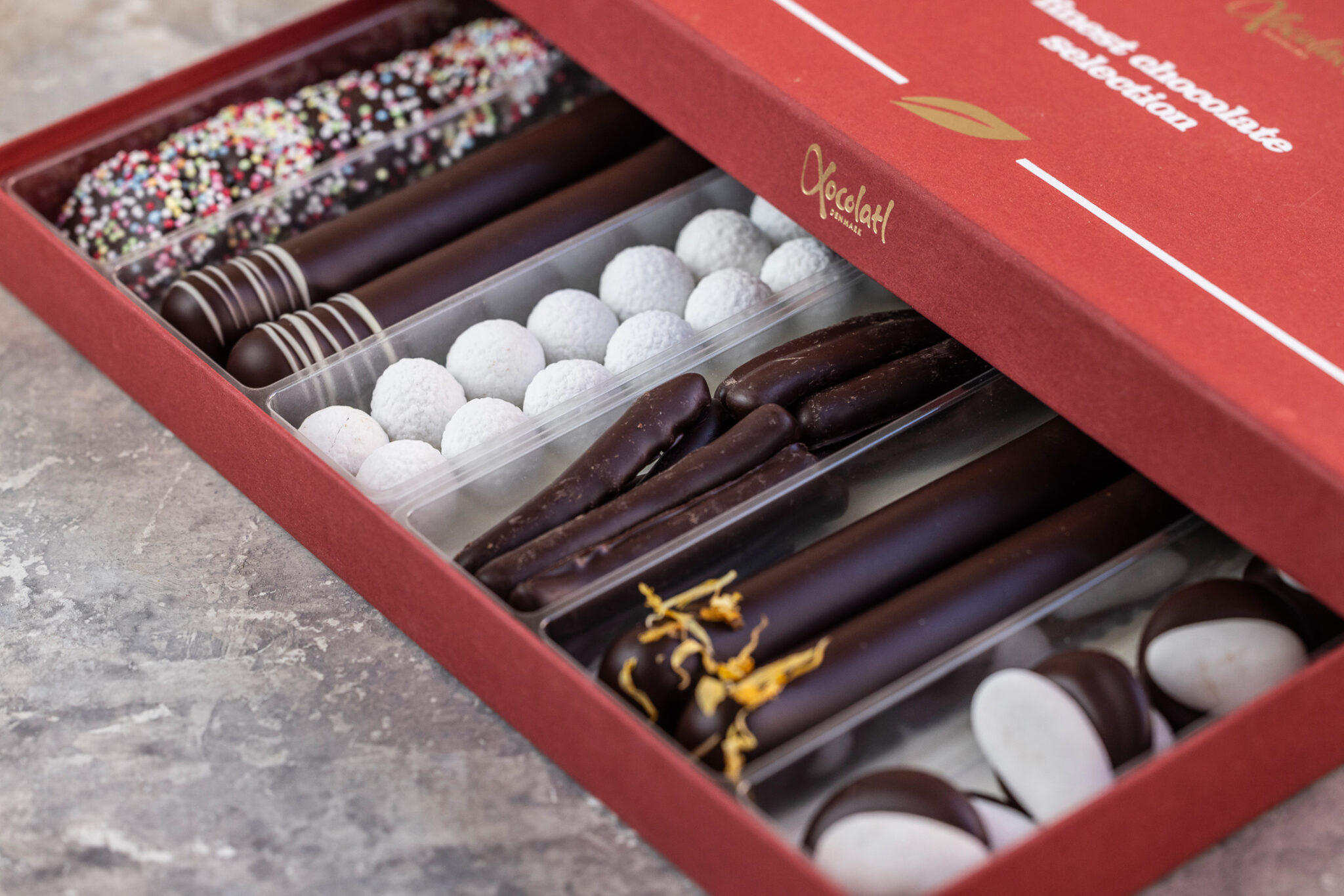 Og oveni det får du her smagen af jul, som vi husker den fra barns ben, da den kommer med lækkert indhold af snebolde, orangegrene, sprøde dronningemandler med mørk chokolade, mintpoletter, 2 rene marcipanstænger med mørk chokolade og 2 marcipanstænger med cognac.