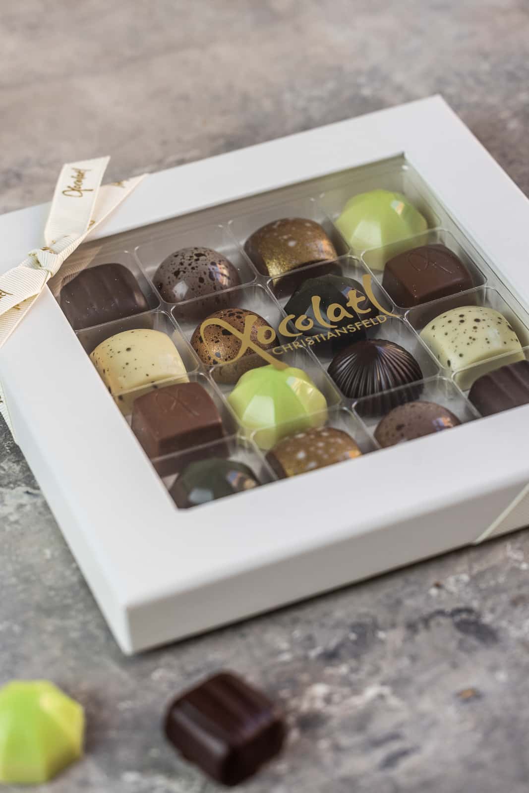 I denne smukke æske er der 16 stykker fyldte velsmagende chokolader med smag af mint, lakrids, saltkaramel, rom, orange, hasselnød, 70% mørk ganache, flødekaramel og marcipan med mørk chokolade
