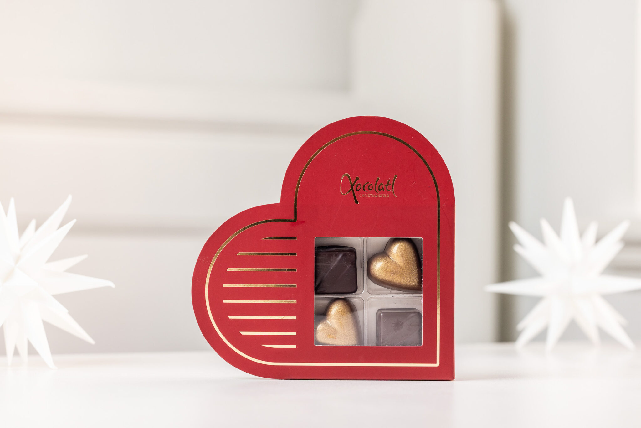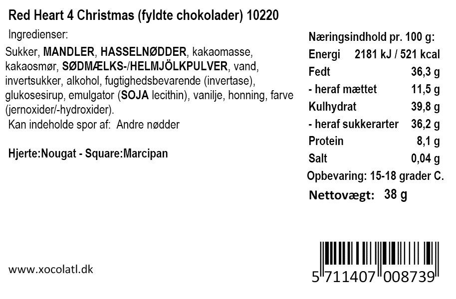 Hvem vil ikke blive glad for at modtage dette fine røde julehjerte. Æsken indeholder 4 smagsfulde fyldte chokolader med marcipan og nougat. Ca. 38 gr.