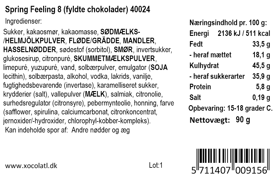 Grøn gaveæske med 8 fyldte chokolader. Skønne smagsvarianter med lakrids, yuzu, marcipan, flødekaramel, mint, nougat og saltkaramel