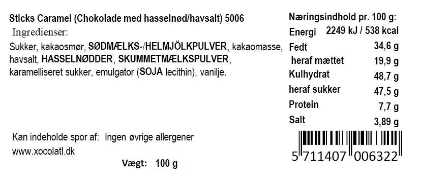 Ingredienser: sukker, kakaosmør, SØDMÆLKSPULVER, kakaomasse, havsalt, HASSELNØDDER, SKUMMETMÆLKSPULVER, karamelliseret sukker, vanilje, emulgator (SOJA lecithin)