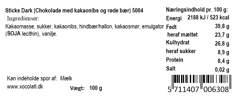 Ingredienser: kakaomasse, sukker, kakaonibs, kakaosmør, jordbær, hindbær, vanilje, emulgator (SOJA lecithin)