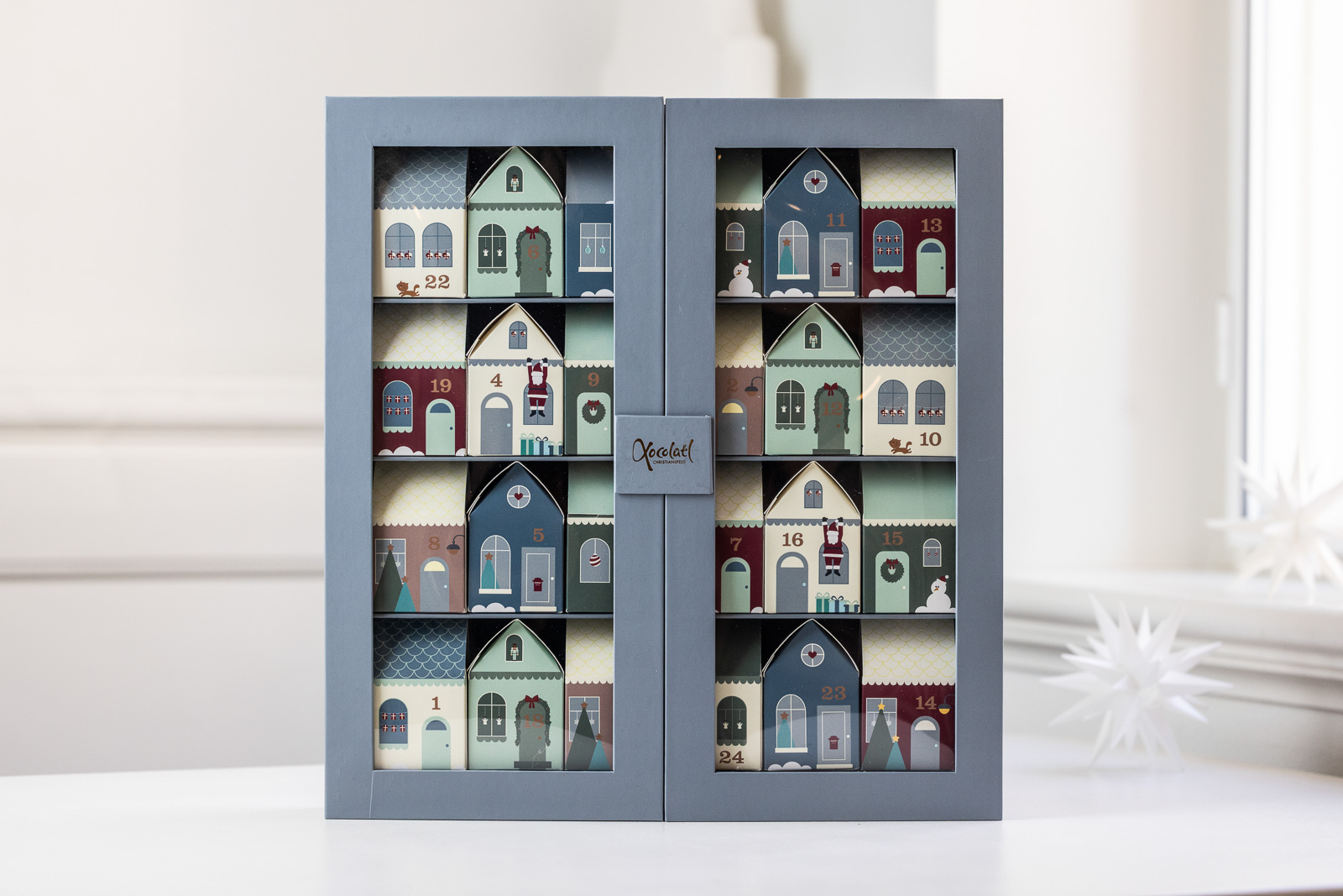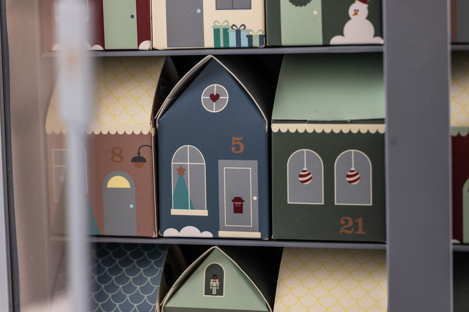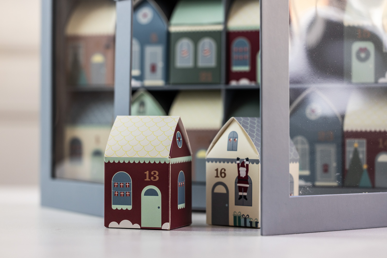 Kalenderen indeholder 24 små huse, som børnene kan lege med efterfølgende – eller hvis man er forsigtig, kan genbruges igen til næste år.