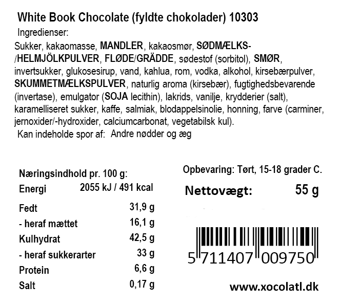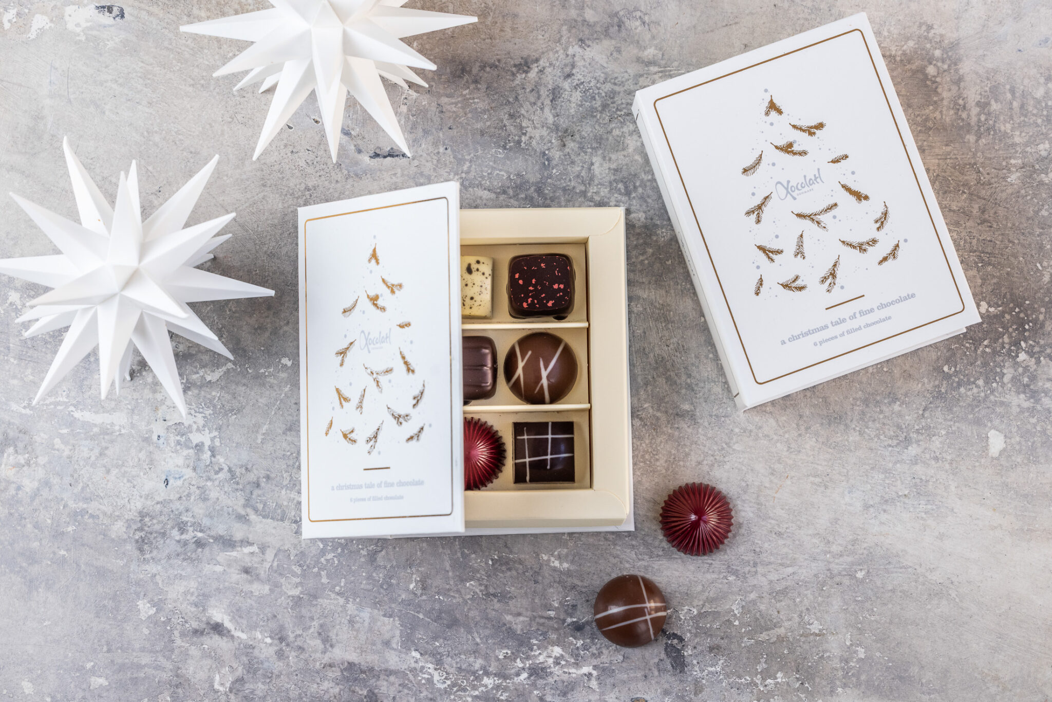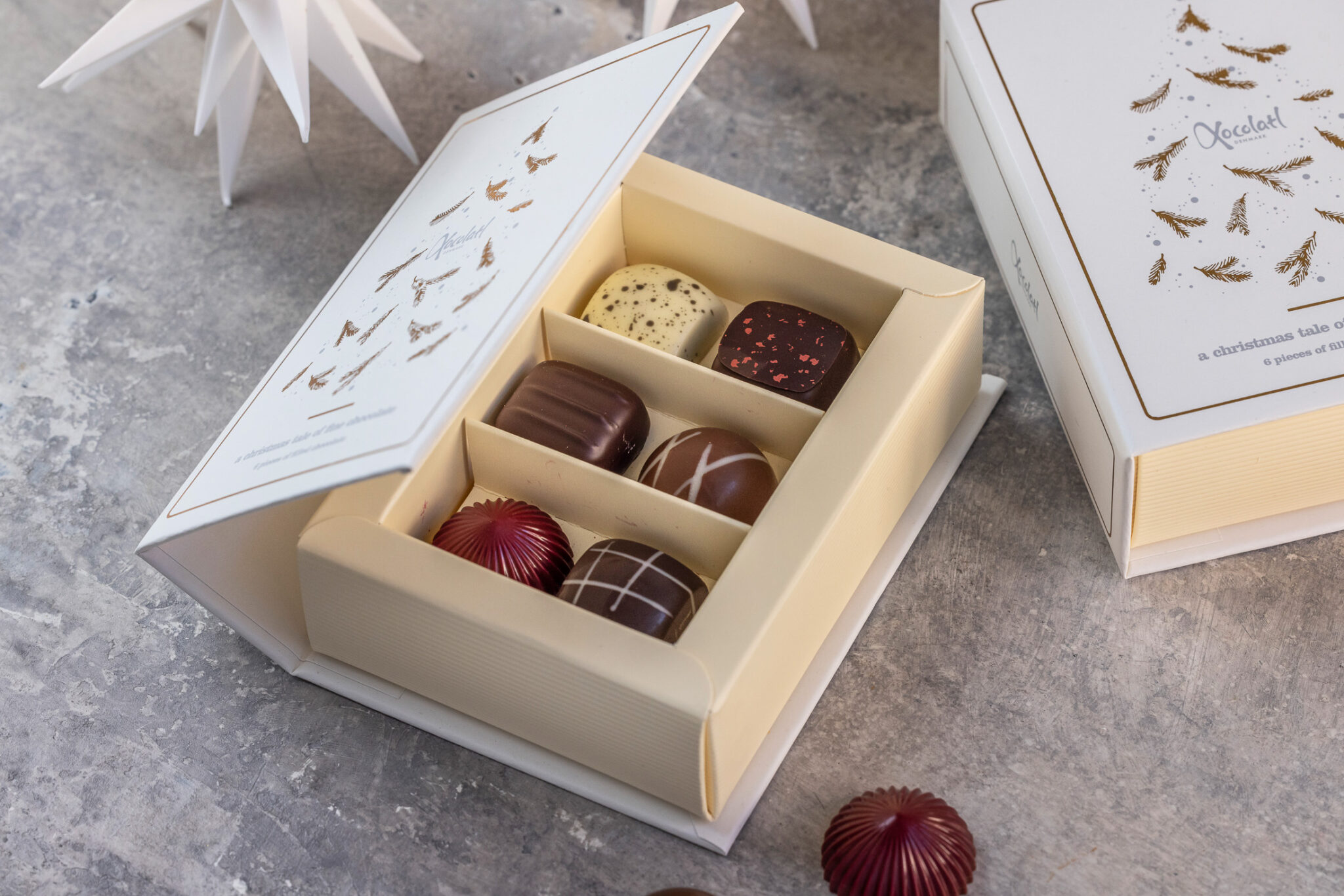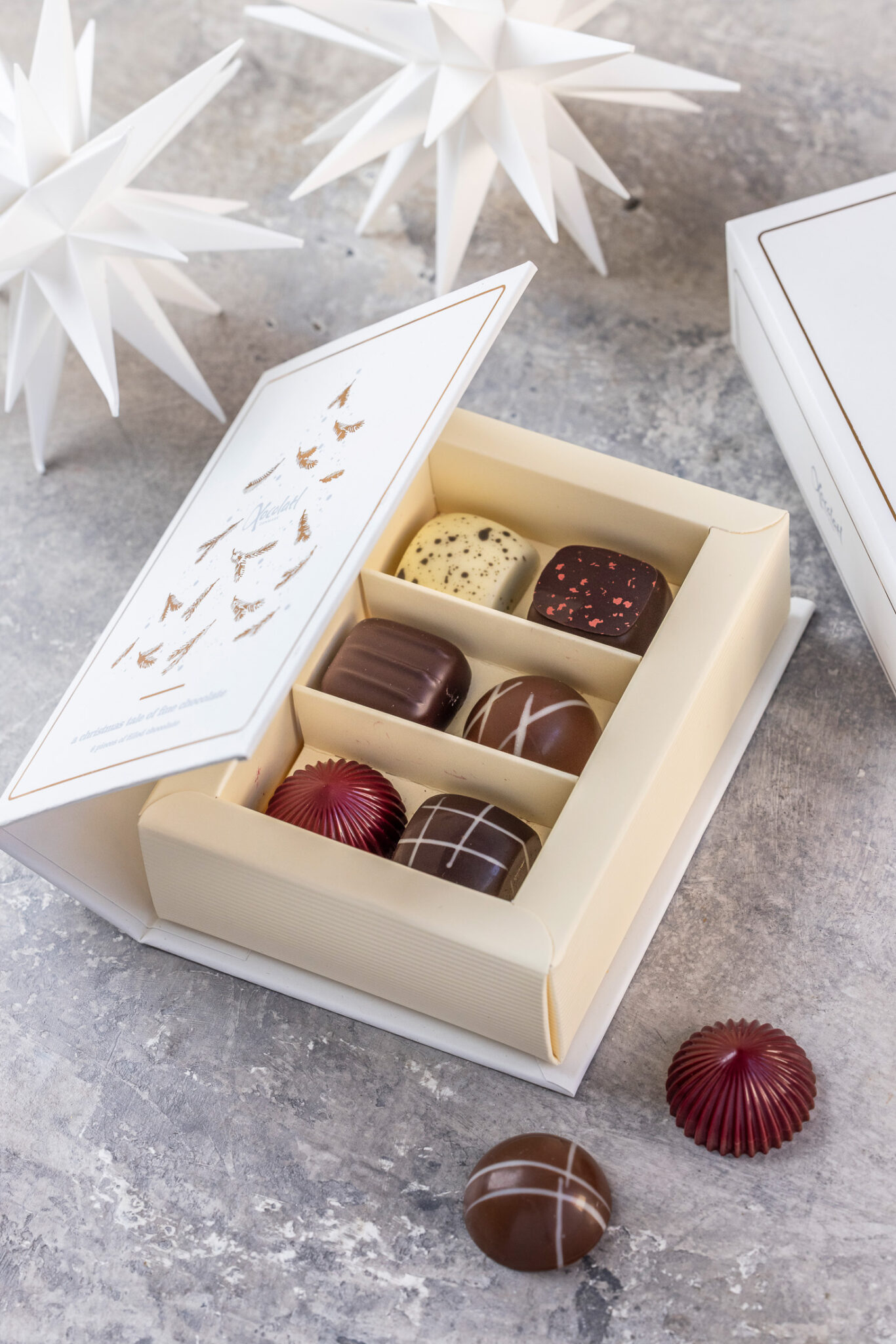 6 fyldte chokolader med forskellige smagsvarianter med blodappelsin, marcipan, rom, kahlua, kirsebærmarcipan, lakrids mm.