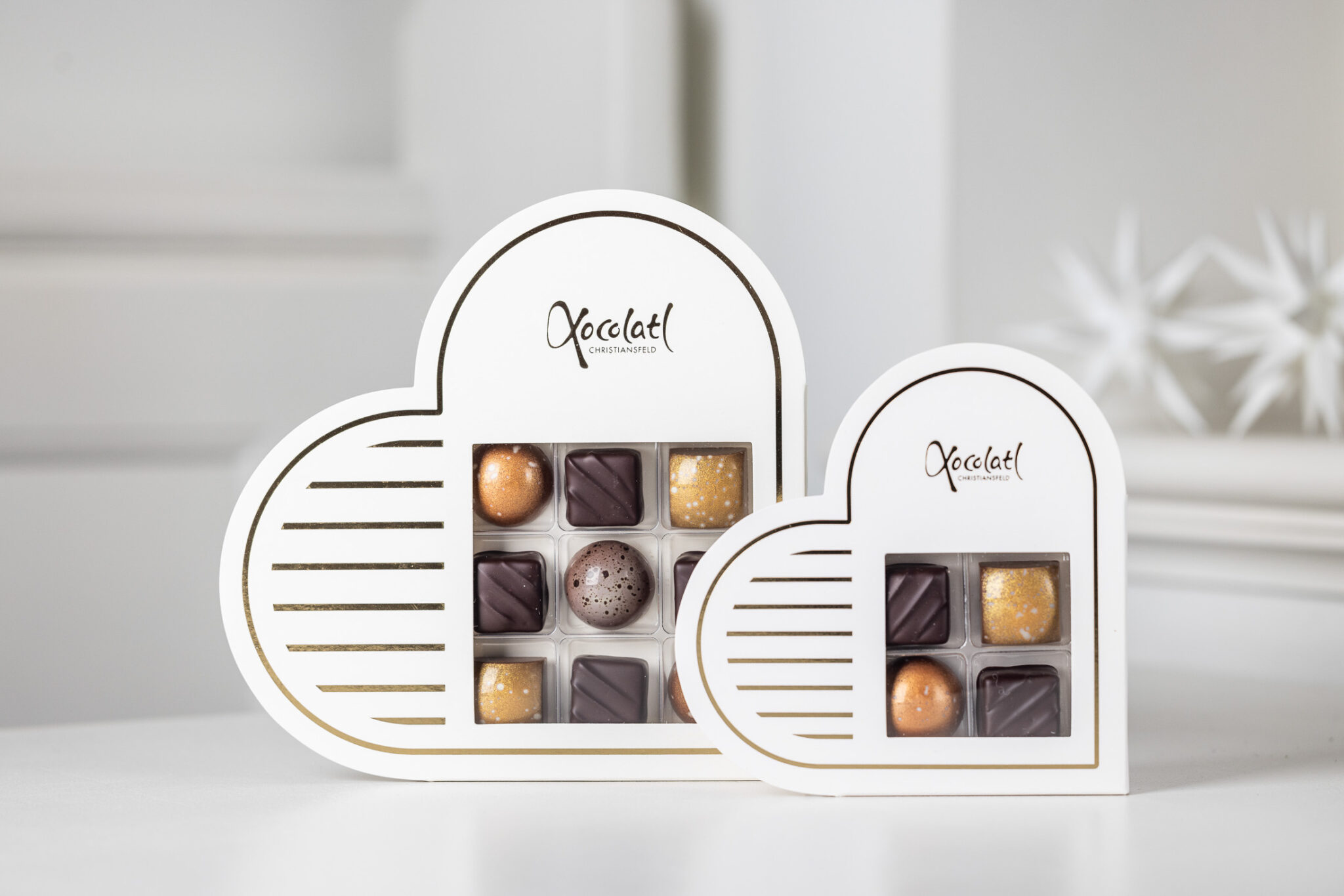 Smuk hvid hjerte æske med guld, perfekt til en lille gave til en du holder af. Den indeholder 9 fyldte chokolader med nougat, marcipan, flødekaramel og saltkaramel